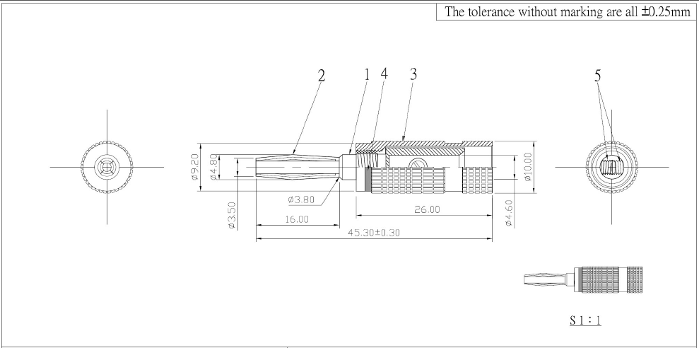 BPM109 Banana Plug Gold Brass 2 screw cable fix (max mm 4,5 wire) for 4 mm hole binding