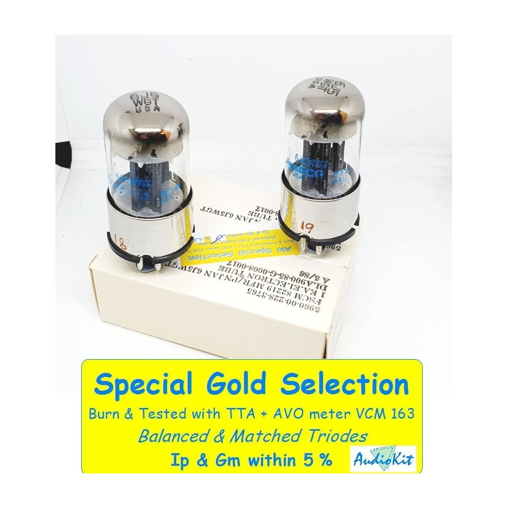 LE MIGLIORI ! LE PIU' PRECISE ! con tolleranze ristrettissime, vengono scelte da noi durante la normale selezione per l'accoppiamento, da considerare che ne esce fuori una coppia così almeno ogni 20-30 valvole misurate, considerate che per ogni valvola (doppio triodo) ci sono quattro misurazioni da mettere d'accordo (Ip e Gm per ciascun triodo) quindi per la coppia di valvole le misurazioni sono ben OTTO e la tolleranza dichiarata riguarda il confronto di tutte ed otto le misurazioni, in questi casi capita spesso che le misurazioni di ogni singola valvola siano addirittura a tolleranza 0% o 2%