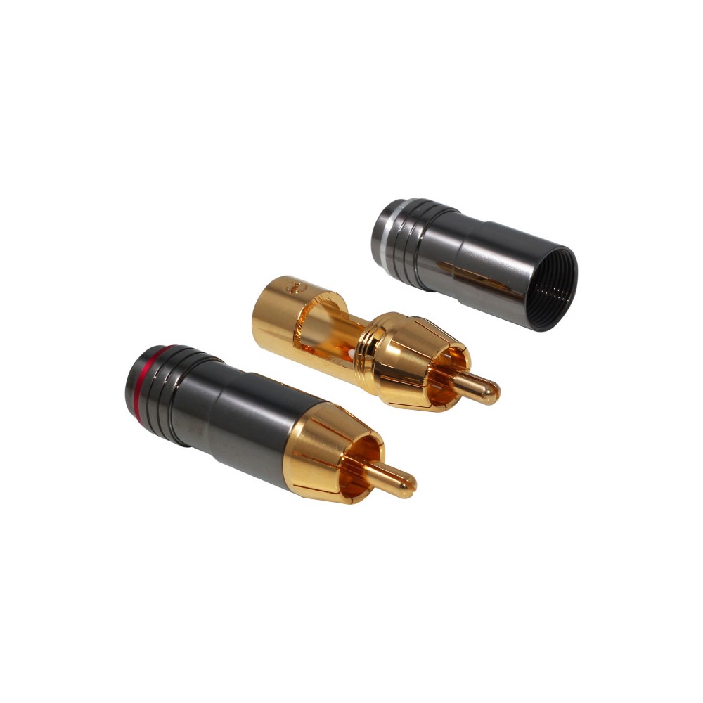 Coppia (rosso/nero) connettori RCA maschio da cavo in ottone placcato oro 24k. Diametro ingresso 8mm. Ampio isolamento in teflon del pin centrale e carcassa massiccia con fermo a vite per la guaina del cavo