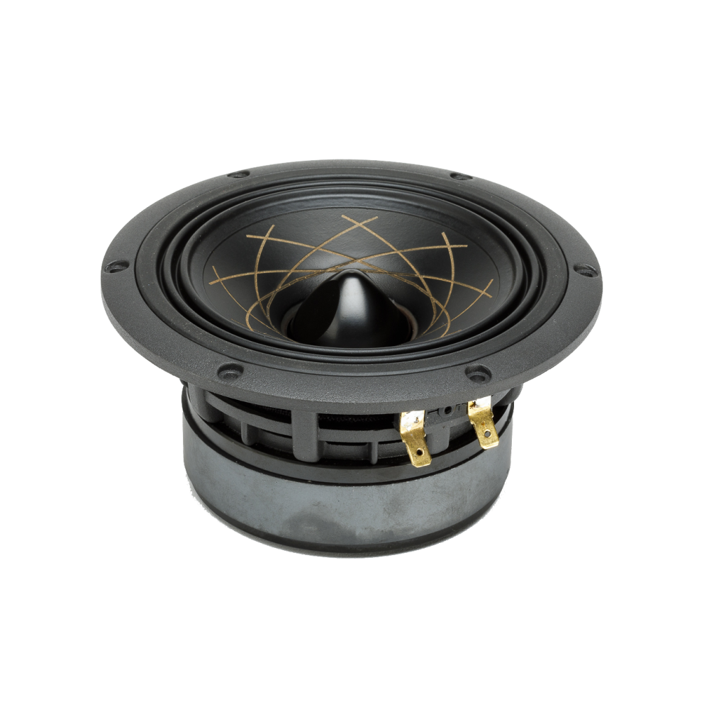 Woofer da 5.5 pollici W 140.38 Fibonacci. Bobina mobile da 38mm in rame con anello demodulante. Ogiva rifasatrice in alluminio. Cono in carta con trattamento smorzante a sandwich diversificato sopra e sotto la membrana, superficie esterna con erosioni a laser che ne aumentano la rigidità. Sospensioni a doppia onda in gomma butilica. Magnete ventilato in ferrite. Spider Conex